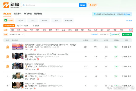 新榜是个内容服务平台,里面的热门榜单挺实用的。我写文章没灵感的时候,经常去这个榜单找找思路。 类似的平台还有易撰、小红鹅这些,不过整体比较下来,还是新榜比较好用。