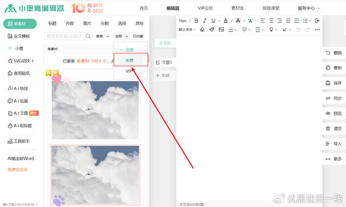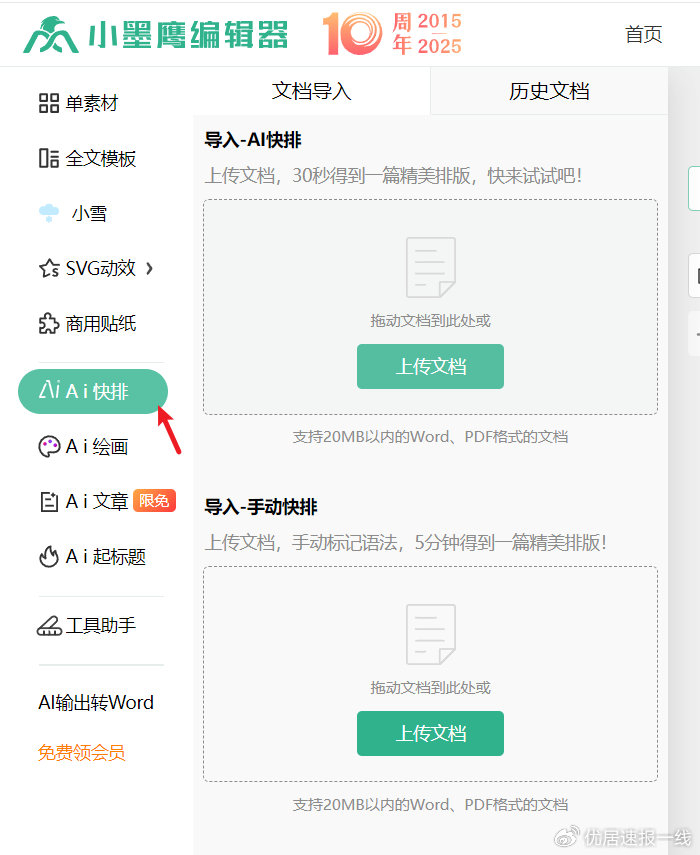 小墨鹰编辑器是一款AI加持的公众号排版工具,里面有很多免费的排版素材和模板,据说有25万+,行业风格也都很全。最值得说的是他们加的AI快排,导入我们写好的文档,全自动排版两分钟就全弄好了,排版效果看起来也很漂亮,真实智能排版。文章编辑排版完成后点“保存”,就可以同步到自己的微信公众号后台草稿箱,去公众号完成发布就可以了。