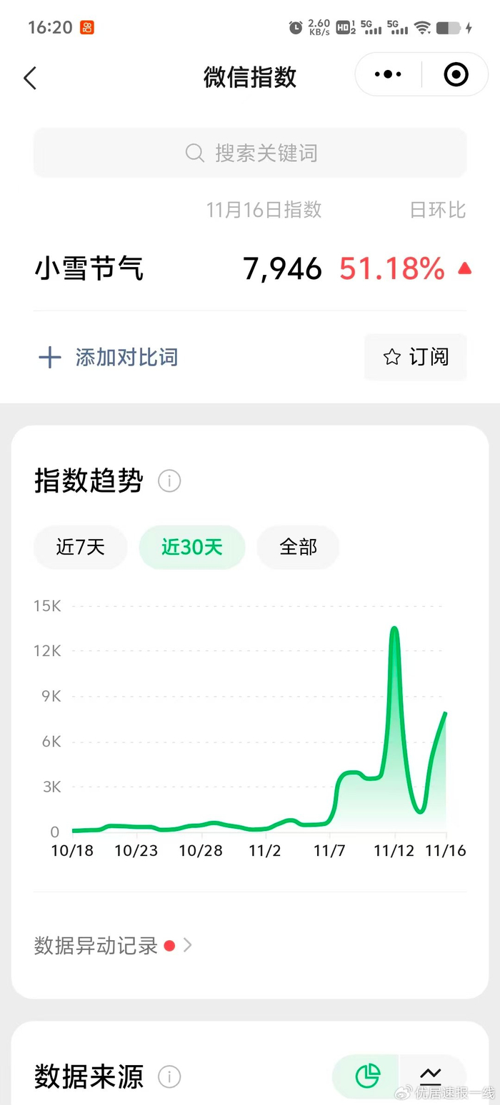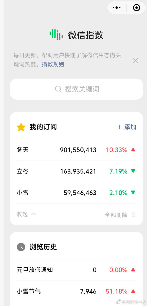 举个例子,如果你是公众号博主,不确定该写"小雪"还是"立冬",可打开微信搜索微信指数,输入【小雪】、【立冬】两个关键词,看哪个数值高,代表这个热度就高。